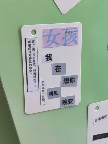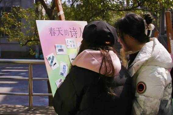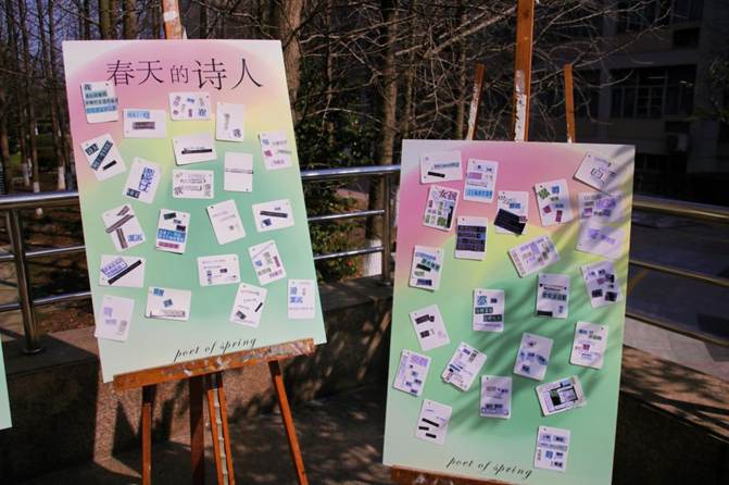 活动的最后,同学们纷纷完成了自己的拼贴诗作品,将精心制作的诗卡在展板上展贴出来。和煦阳光下,一首首别出心裁的诗歌,如同春日绽放的花朵,填满了展板,也温暖着同学们的心。