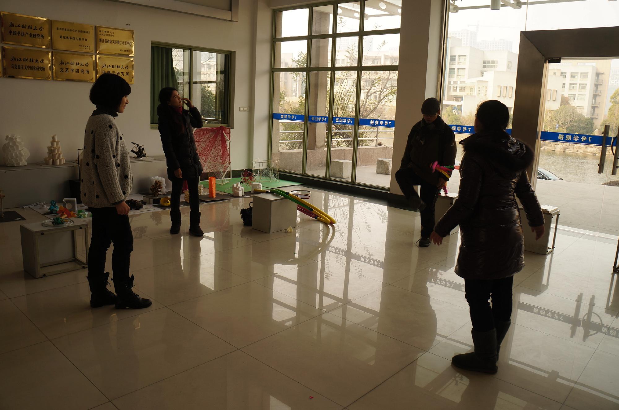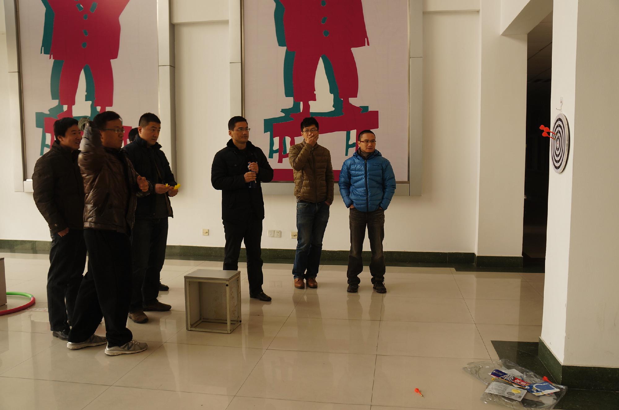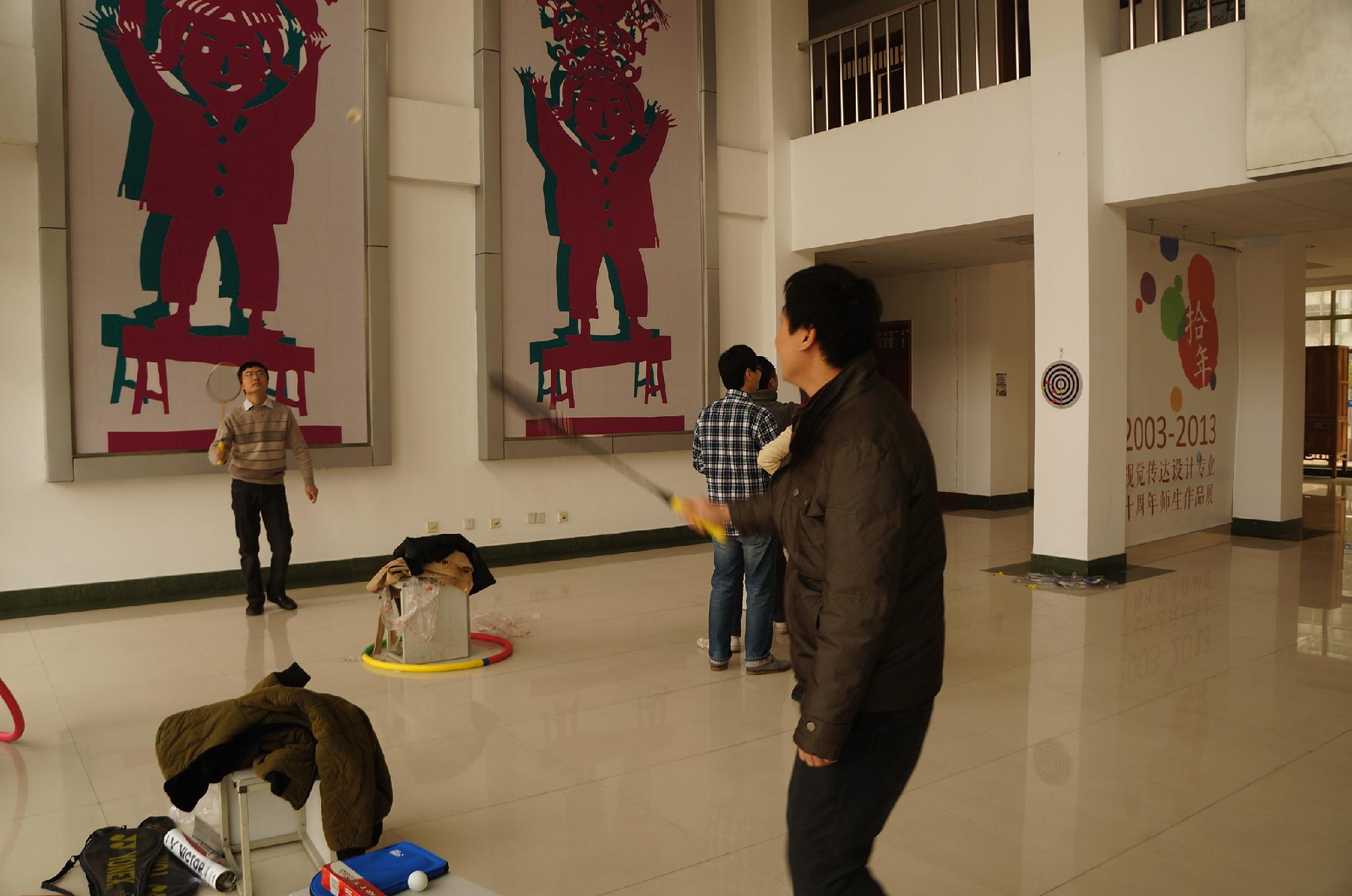 一切因陋就简。下午一点,一楼大厅靠边放置的凳子上就摆开了各类运动器具:羽毛球、跳绳、毽子、飞镖……展厅也灯火通明。全院教师齐聚一堂,有的踢毽子,有的转呼啦圈,有的跳绳,有的掷飞镖……一开始,大伙儿都是单干,渐渐的,就都发展成集体项目了:一个毽子在几个人的脚间翻飞,偶尔还会飞出场外,观战的便会毫不犹豫地把它踢回场内;跳绳的一人不过瘾,两人一起;本用于颠球的羽毛球拍挥舞了起来,就在呼啦圈、飞镖、跳绳、毽子之间,见缝插针地捉对厮杀开了;飞镖盘前围了一群人,目标明确,直指靶心,大有不达目的不罢休的气势。没有达标要求,也没有奖品,但是大家都玩得不亦乐乎,笑声不断。还有喜爱乒乓球的老师,更是直接杀向教工之家的乒乓球台,也不顾灰尘,就开始推挡扣杀,让乒乓球在台上留下一串的足迹。