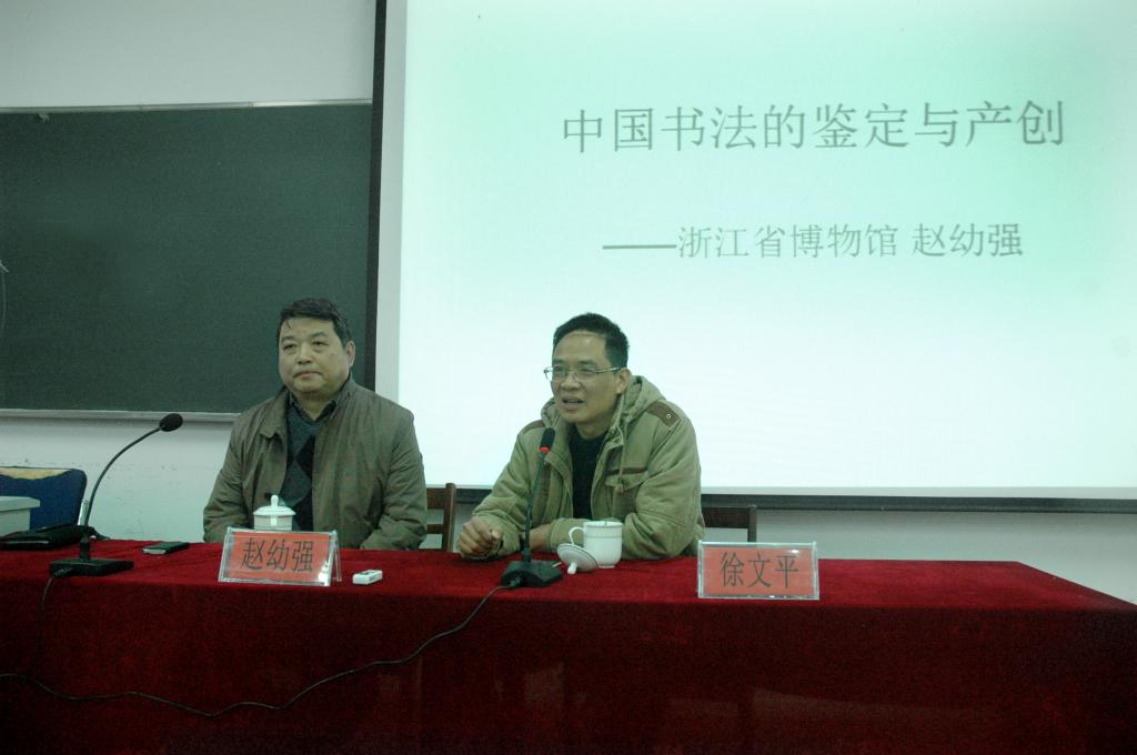 2015年12月9日下午,浙江省博物馆研究馆员,书画部主任,中国美院兼职教授,中国社会科学院研究生院兼职教授赵幼强应邀来我院举行主题为“中国书法的鉴定与产创”的讲座。讲座由我院徐文平教授主持。