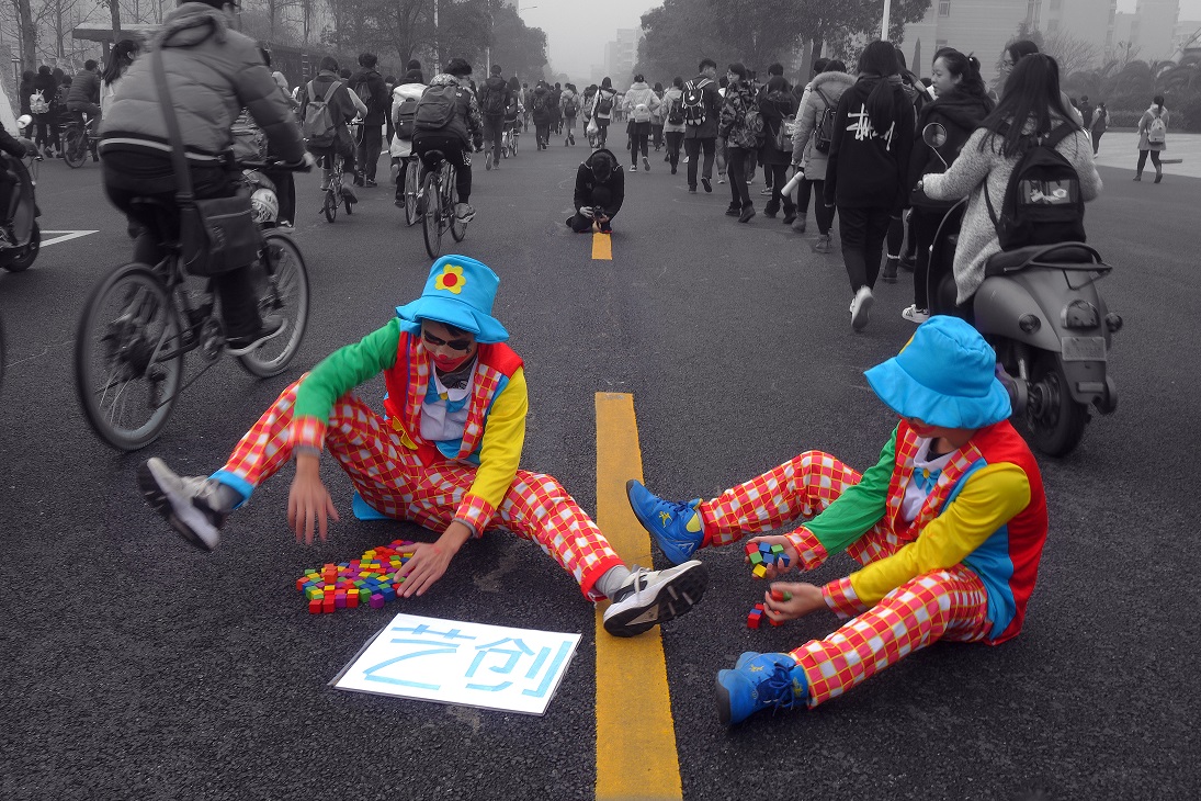 昨日,下沙飘着雨花,空气了透露着一股子寒气,但这丝毫不影响浙江财经大学安博(中国)一站式服务平台学生在校园内表演行为艺术。而且,这些学生一来就是两三拨。十个学生一字排开,用各种创意画标志、小丑打扮的学生坐在地上搭积木、西装男脸上涂满金色和银色颜料,一动也不动地立在路上……