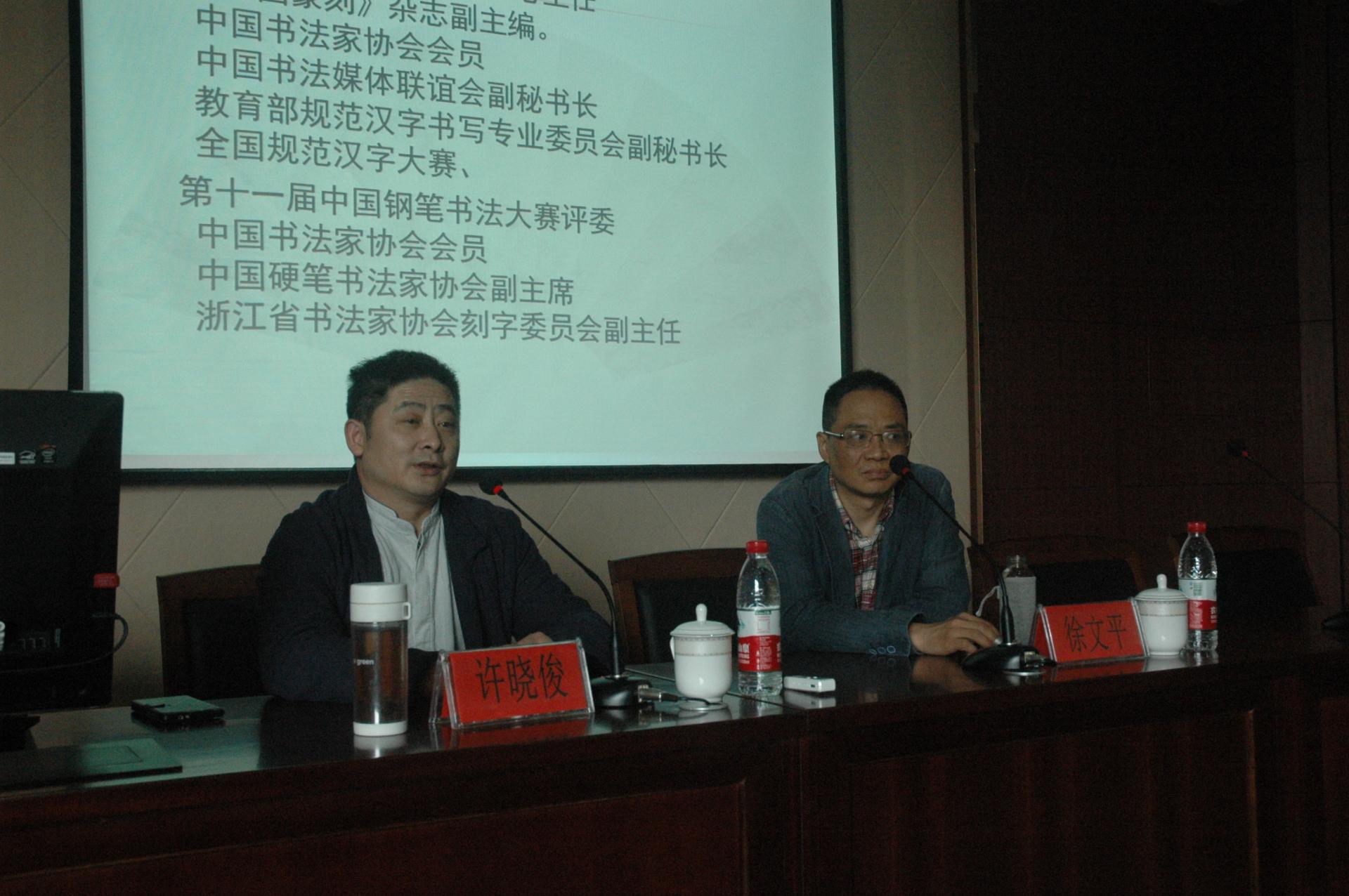 2016年4月12日下午,西泠印社出版社教材中心主任、《中国篆刻》杂志副主编许晓俊先生应邀来我院举行主题为“中小学书法学科确立带来的书法相关产业思考”的讲座。讲座由我院徐文平教授主持。