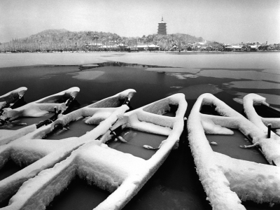 雪后,西湖岸边的泊舟与远处的雷峰塔遥遥相望。摄于2008年。邵大浪摄/光明图片