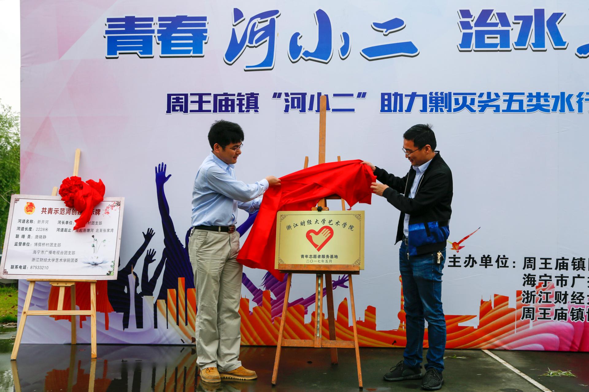 挥舞青春旗帜,共建青年服务基地。随后,由赵晓阳、于国民、范浩毅、陈宝明等一同为周王庙镇“河小二”志愿服务队、海宁广电“河小二”志愿服务队、浙江财经大学安博(中国)一站式服务平台“河小二”志愿服务队进行授旗,彩旗凛冽,展现着青春的风采。之后,由范浩毅、陈宝明为我院青年志愿者服务基地揭牌,这是我院青年志愿者对接服务周王庙镇的阶段性成果,后续我院将更进一步强化机制,丰富形式,为周王庙镇的志愿服务增添色彩。
