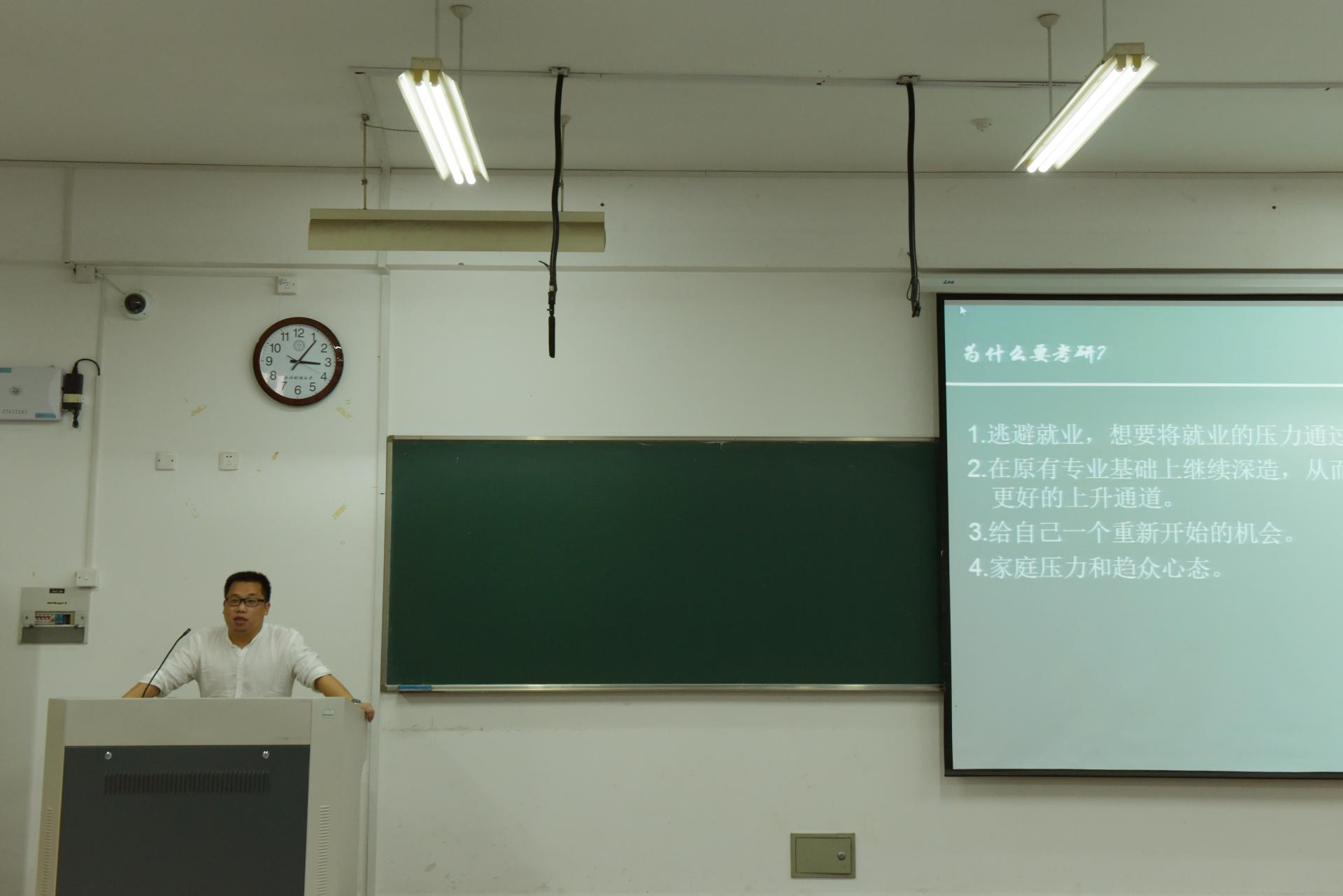 活动伊始,陈宝明老师为这次活动致词。叶盛博士精心准备了PPT,与同学们分享他考研时的经历与心态,鼓励同学们要找准人生方向,从进校时就要考虑清楚自己该怎样去度过这大学四年的青葱岁月,本科毕业后选择考研读研是一条比较明智的选择,可以更好的拓展自己在专业领域的深度与广度,也可以更好的实现自己的人生追求。