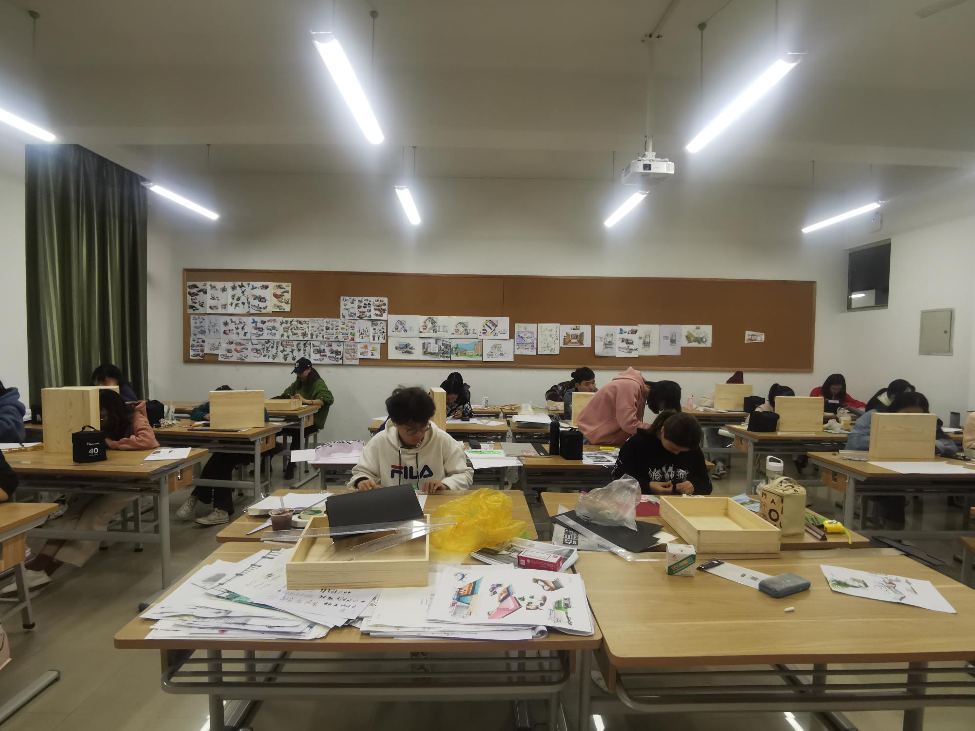 在具体设计表达上,课程采用30cm*40cm*8cm的木质箱体,在鼓励学生运用绘画技法展现主题的同时,还可以发掘采用其他创新形式的表达。结合中国传统文化剪纸、皮影、木作、榫卯等制作工艺,合理联想选取多元制作材料,在方寸空间中,立体化呈现学生们想要表达的主题思想。