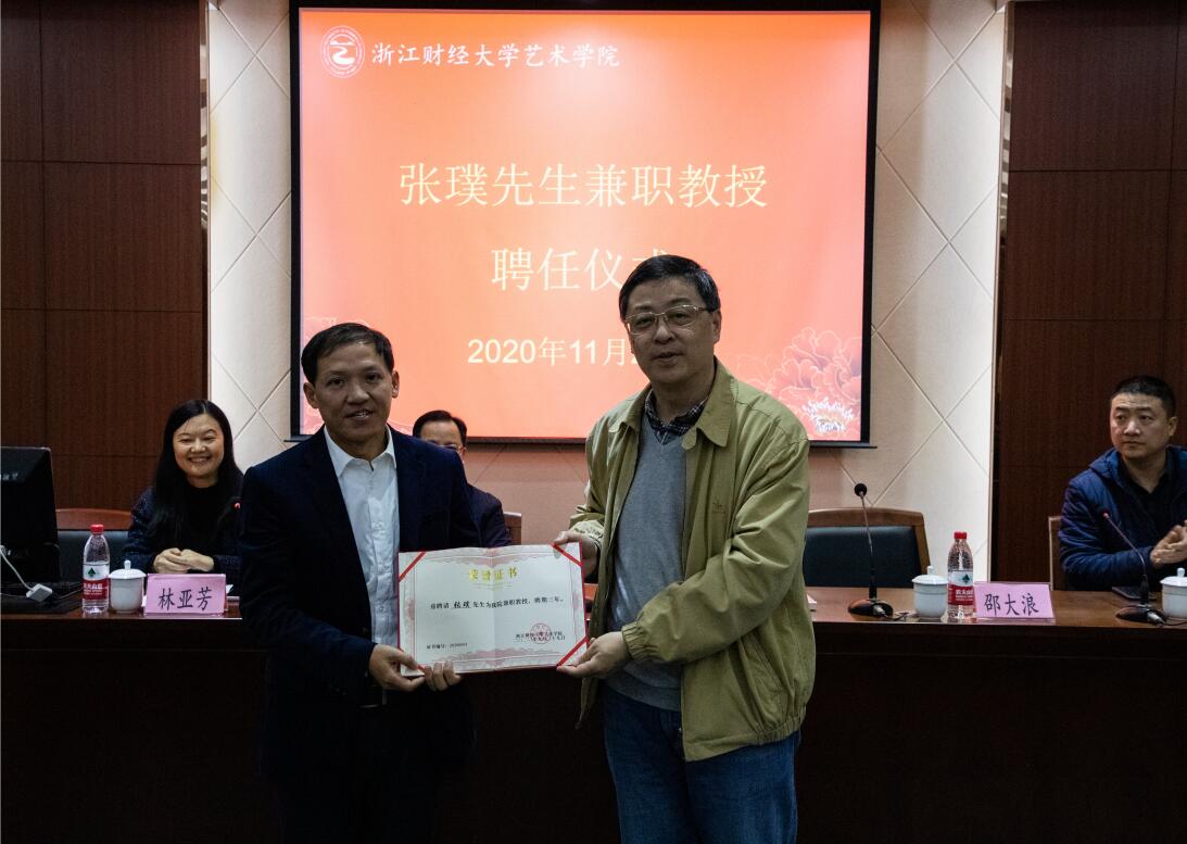 11月26日下午,我院举行张璞先生兼职教授受聘仪式。院长邵大浪代表学院向张璞先生颁发兼职教授受聘证书。校党委委员、宣传部部长楼胆群,院党委书记林亚芳,副院长林洲等出席此次受聘仪式。