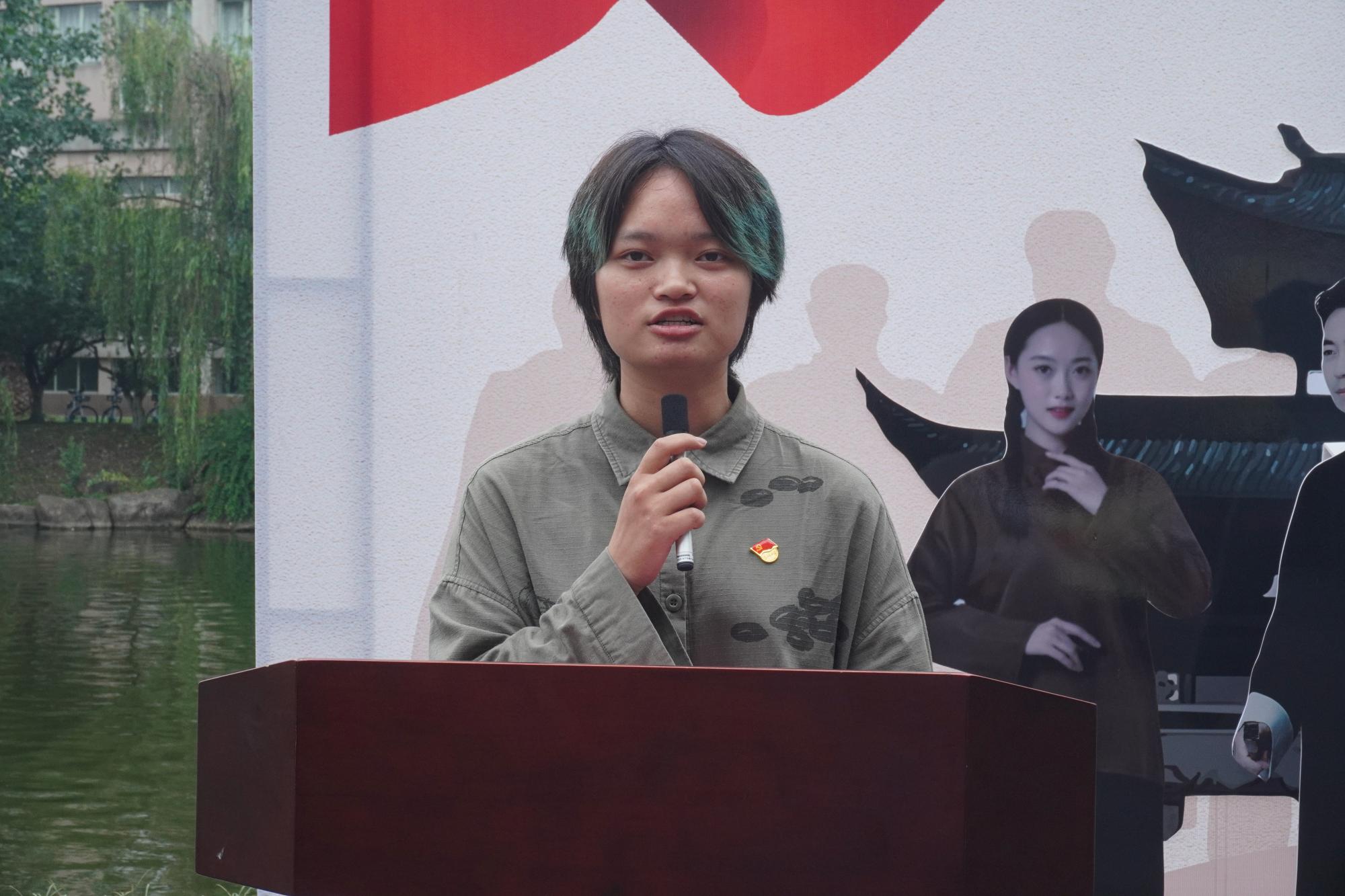 紧接着,学生代表陈红霞发言,她介绍此次活动参与人数达122人,涵盖党员、入党积极分子、入党申请人,其中还包括了45名毕业生党员。充分发挥艺术学子的专业特长,以平面设计、场景布置、模型搭建等形式重现百年来的五个重点历史时刻,共展示五个沉浸式场景,涵盖子作品百余幅,在“行走的课堂”中深化党史学习教育。