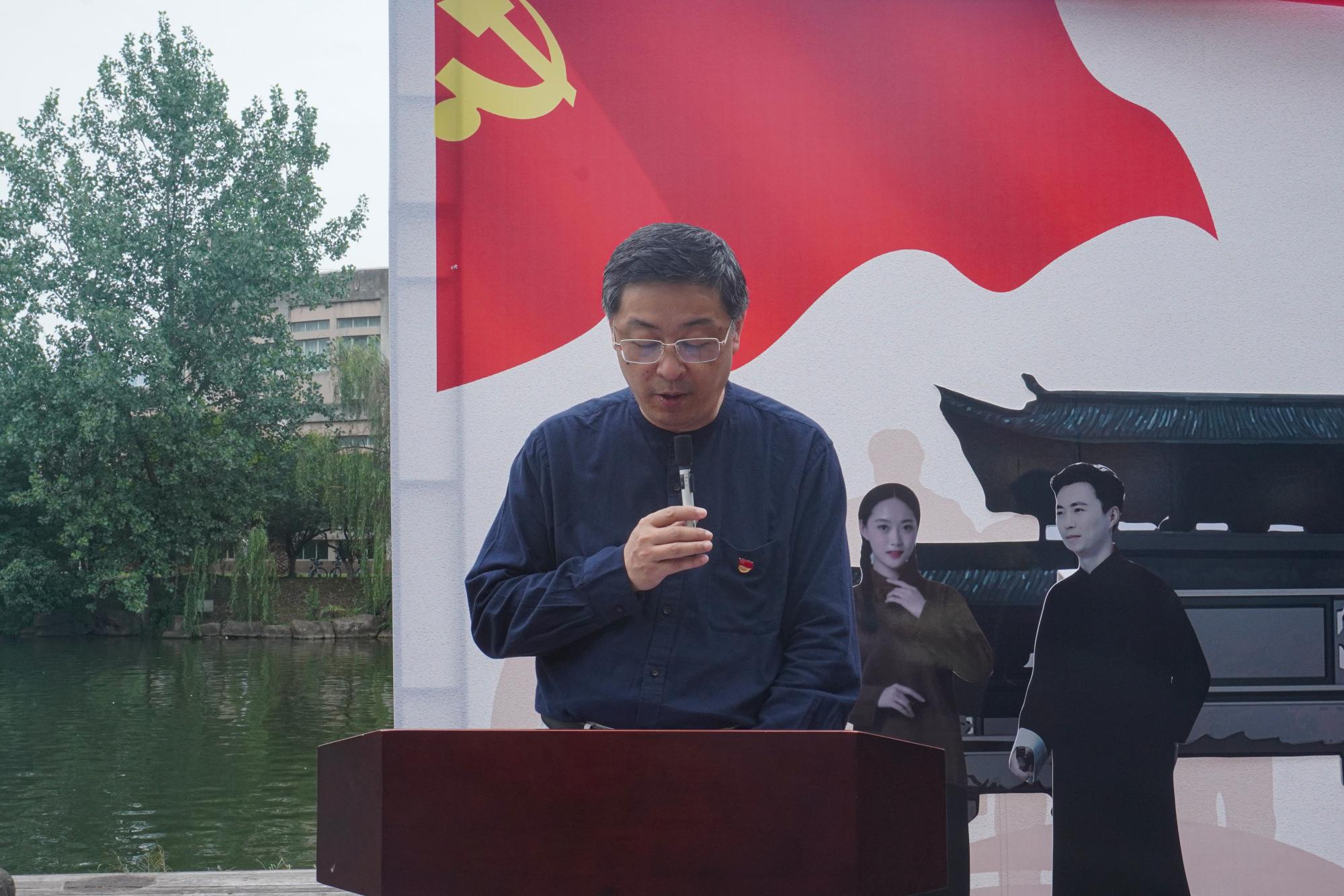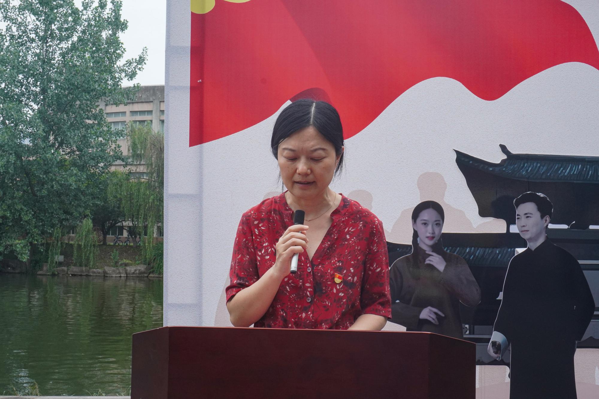 党委书记林亚芳作题为“百年辉煌,砥砺初心向复兴”的讲话,她详细介绍了本次沉浸式主题展的五个篇章和布展初心,向为本次展览挥洒汗水和心血的同学点赞。她表示:同学们融校史学习于党史教育,展览从修业亭起沿着学涯湖畔依次展开,通过模范书写、艺术加工,让我们可以零距离感受波澜壮阔历史的开篇,激励每一位共产党人保持永不消逝的初心和永不懈怠的奋斗精神。同学们融专业实践于党史教育,运用专业所长践行学史力行,匠心独运将废旧材料回收再利用还原南湖红船,纯手工制作再现百年征程的起航地,让青年党员在学思践悟中深化党史学习,坚定理想信念,强化使命担当。她向学院全体党员发出号召:星光不问赶路人,历史属于奋斗者,让我们永远跟党走,在民族谋复兴、人民谋幸福的道路上接续奋斗!